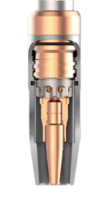 Experience a remarkable reduction in the usage of standard system contact tips, minimizing replacement frequency by up to 3 to 5 times. The COLDTip system effectively maintains contact tip temperatures at a low level, preserving copper hardness and minimizing wear over time. Additionally, it prevents the sticking of weld projections by ensuring they remain cool. This innovative design features a unique cooling chamber where half of the contact tip resides, enhancing both electrical and thermal transmission efficiency through the tip's cone.